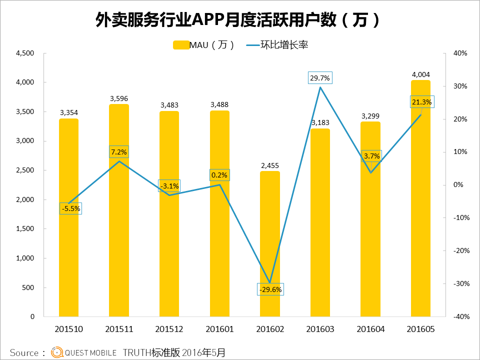 从QuestMobile数据来看,外卖服务行业APP的MAU从去年10月以来在3500万上下波动,其中今年2月出现断崖式下跌,MAU活跃度仅2455万。当然这也是自然现象,大家都回家过年吃妈妈做的饭了嘛!不过,从今年3月以来,整个外卖服务行业出现良好增长趋势, 5月外卖行业APP月活环比增长率达21.3%。