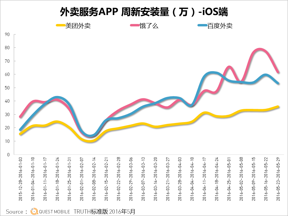 在新安装表现上,QuestMobile数据显示,美团外卖从2月份开始掉队,百度外卖则从2月份开始抬头,饿了么在中间犹犹豫豫自己是不是要跟上,总体上,三家就这么囫囵吞枣、互相试探地地往后过日子的感觉。