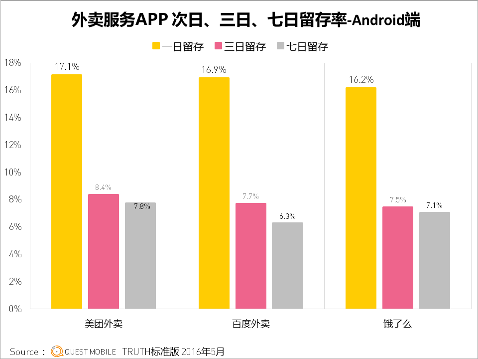 而在留存率上,百度外卖表现相对良好,则基本介于美团外卖和饿了么之间。iOS端的一日留存率达17.9%,Android端的一日留存率达16.9%。
