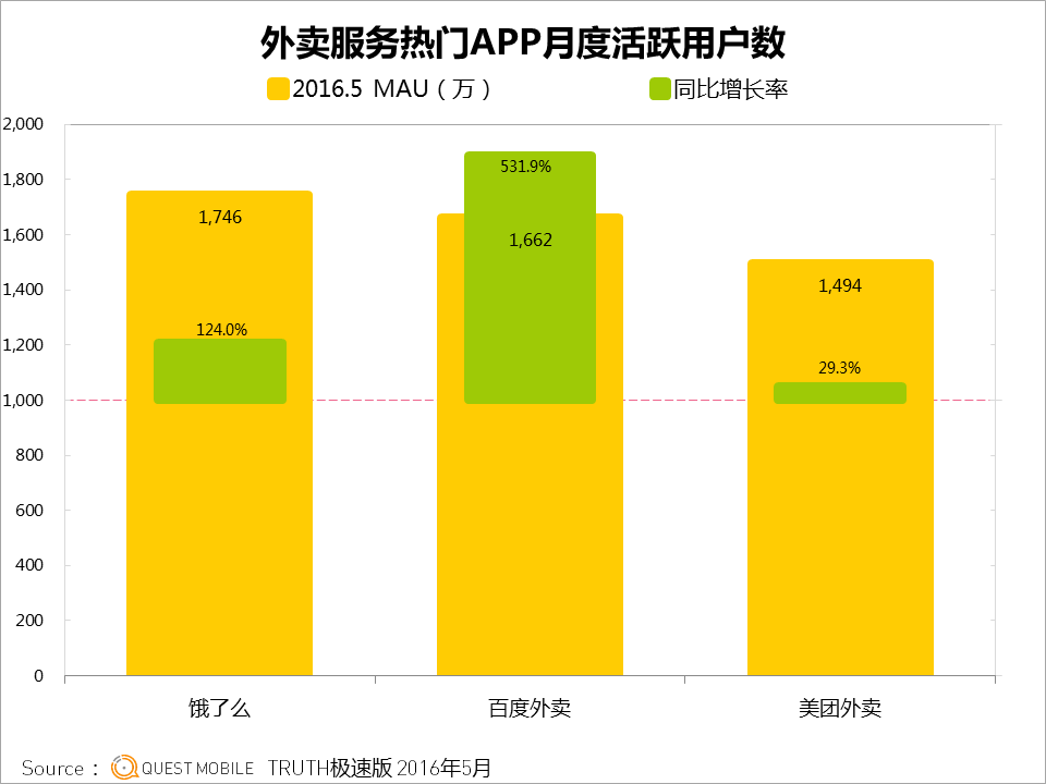 这一大格局之下,但从5月份数据来看,饿了么依旧排在第一位,MAU为1746万,百度外卖排第二,MAU为1662万。同时,百度外卖同比增长率达到了惊人的531.9%,远远高出饿了么和美团外卖。