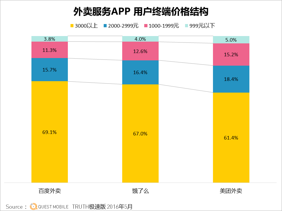 而在外卖服务APP用户终端价格结构上,百度外卖3000元以上机型占比69.1%,虽然说三巨头当道,但当外卖O2O即将进入分水岭,行业也渐趋成熟后,盈利能力是否强大才是王道啊!很显然,百度外卖在高端用户的市场份额上已占据领先位置,接下来如何,拭目以待了。