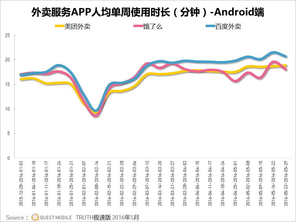 以人均单周使用次数为例,从去年12月底到今年5月底,饿了么在安卓端持续占据优势,不过在5月份开始与美团外卖有纠结状态,百度外卖则持续在安卓端次数处于垫底状态。